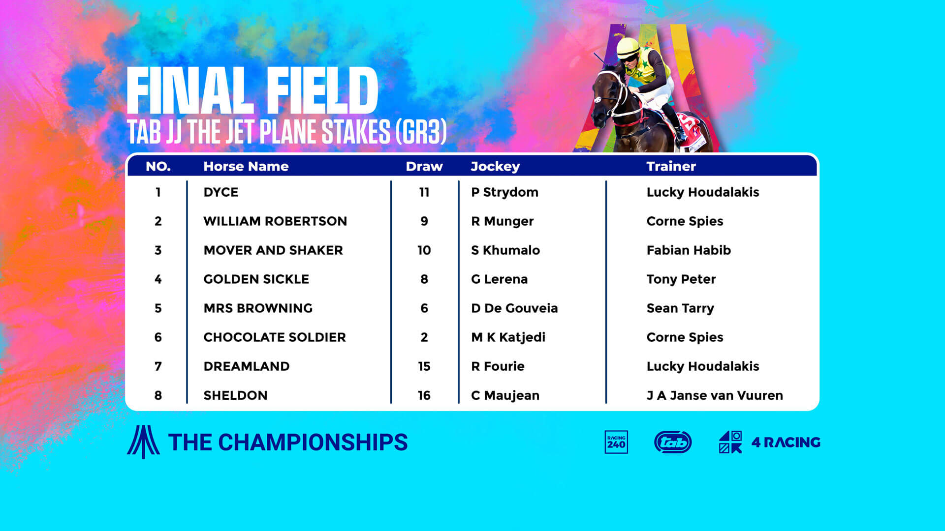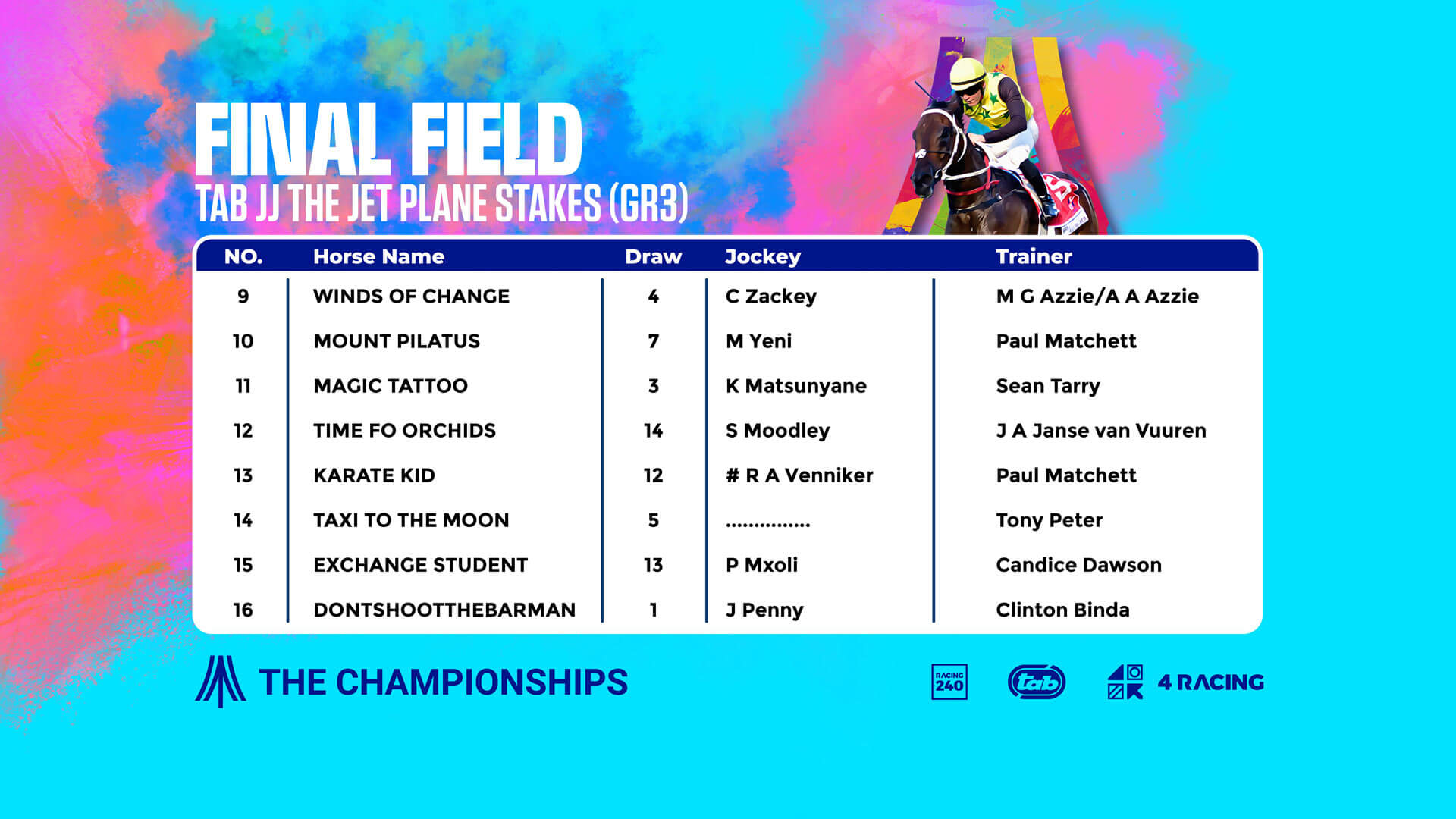 A 16-horse field is carded for the running of the TAB JJ The Jet Plane Stakes (G3) to sprint home from the 1000m mark and we will see Mover And Shaker defending his title, contesting against a strong field.