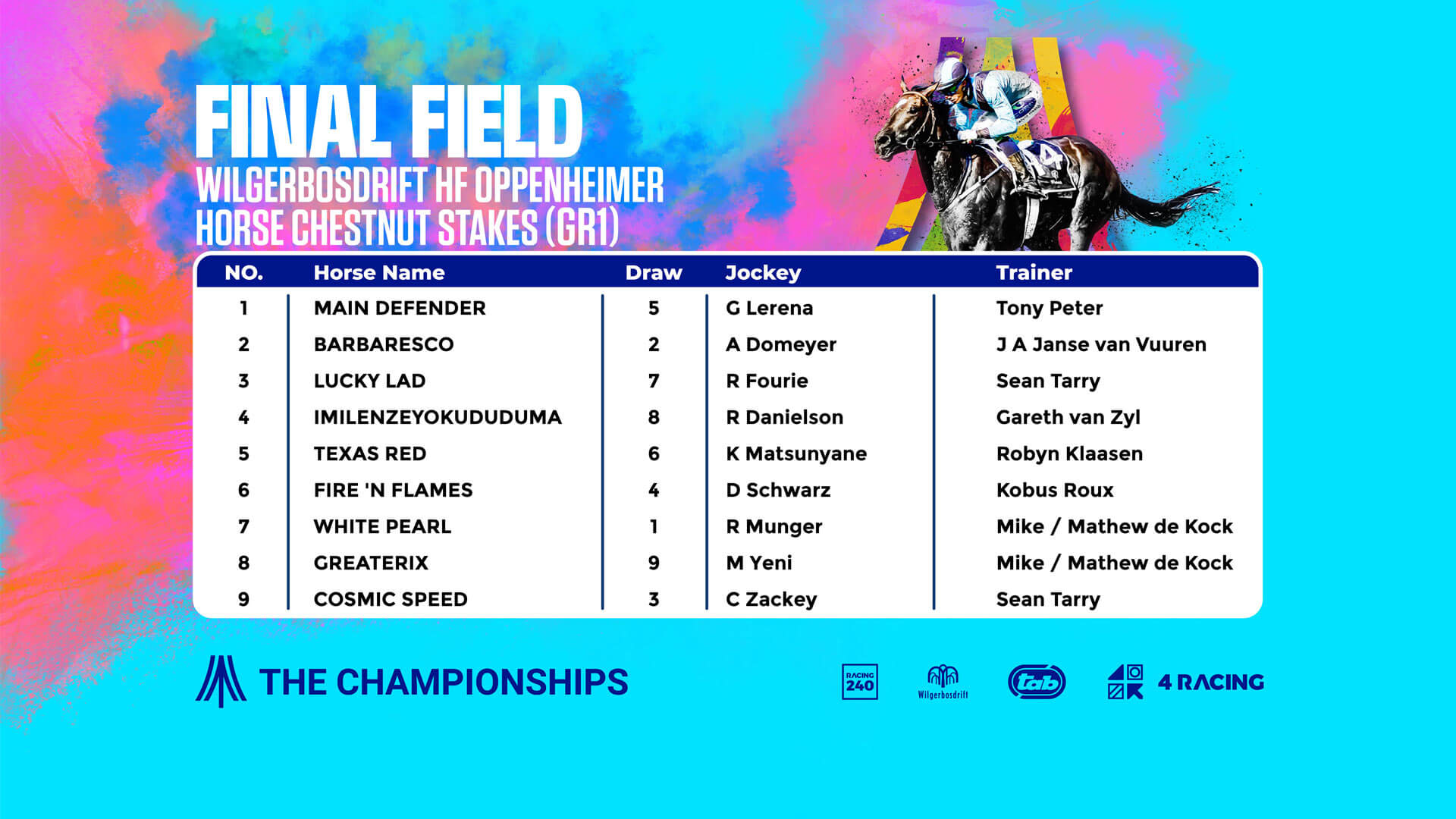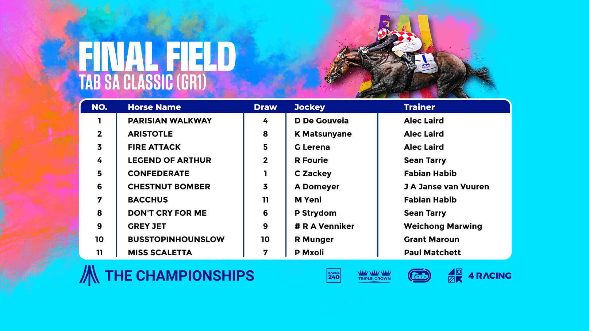 Trainer Alec Laird has three contenders in the TAB SA Classic (G1) including winner of the first leg of the Triple Crown, Parisian Walkway, as well as Aristotle and Fire Attack. Here is the final field for the Grade 1 TAB SA Classic: