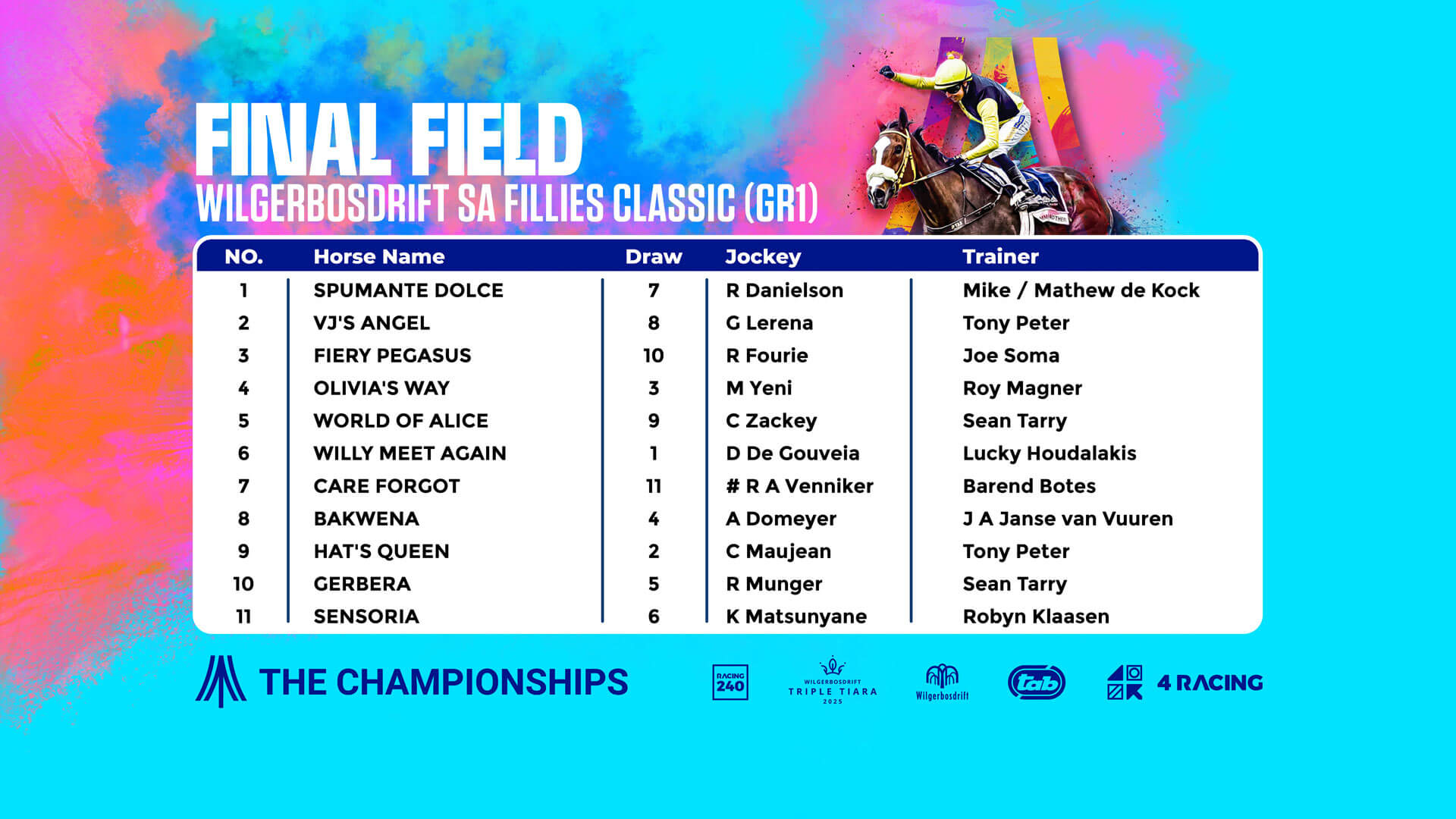 The Wilgerbosdrift SA Fillies Classic (G1) will be an interesting rematch between Spumante Dolce and VJ’s Angel after an exhilarating Gauteng Fillies Guineas race.