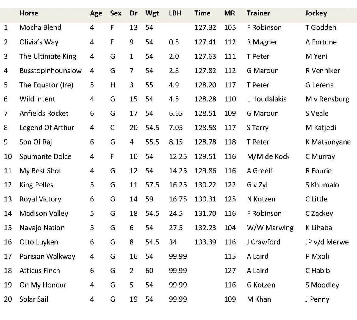The day’s feature went the way of KZN raiders trainer Frank Robinson, jockey Tristan Godden and 4yo Mauritzfontein home-bred Mocha Blend (Ideal World – Mocha Special).