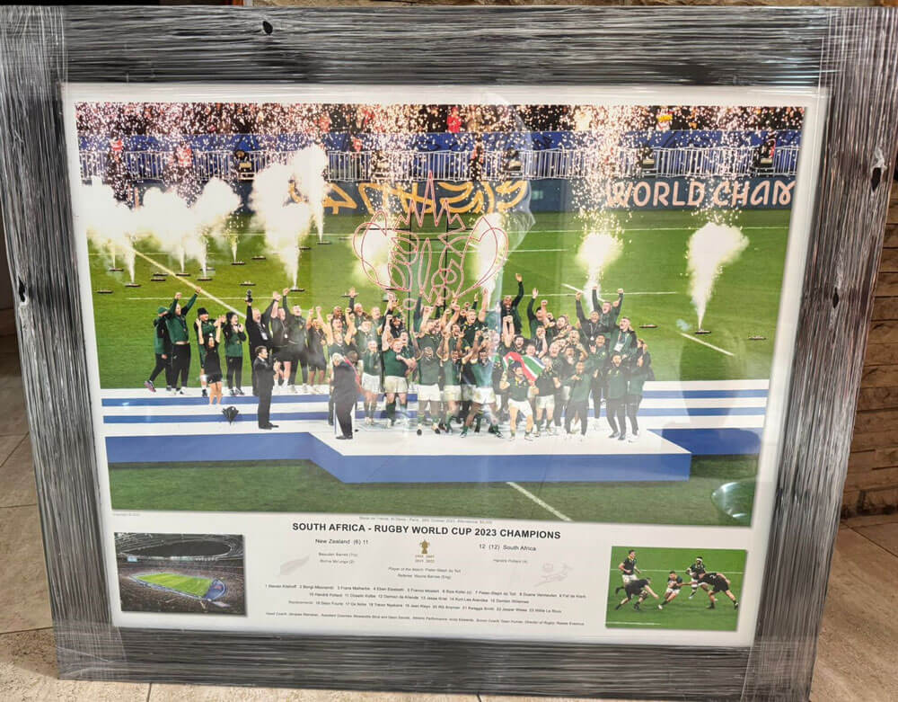 - A framed photograph of the SA Rugby World Cup Champions by renowned sports photographer Kevin James